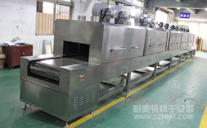 2、外形尺寸(約):總長14000mm*總高1490mm*總寬1040mm,地面到網(wǎng)帶的高度為850mm,產(chǎn)品傳送帶寬度為600mm,爐體內(nèi)進(jìn)料高度為300mm;烘干部分總長7500mm,分4段,第一段長1500mm,后三段各長2000mm, 冷卻部分長4000mm,分2段,每段2000mm,爐蓋上加裝0.75KW強(qiáng)力離心風(fēng)機(jī),爐體底部加裝收風(fēng)斗(鍍鋅板烤漆),兩端緩沖部分各長400mm, 緩沖區(qū)進(jìn)料高度為200mm,各加手動(dòng)調(diào)節(jié)門,進(jìn)料部分長850mm,出料部分長850mm , 爐體前后裝有急停開關(guān)。