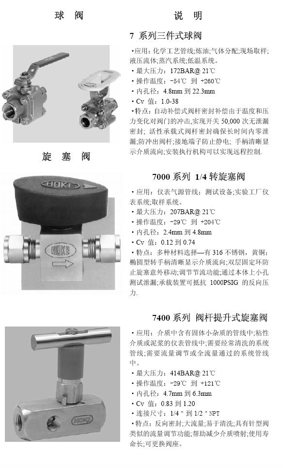 并且HOKE公司經過數(shù)年的經營,已為其設計和生產的高品質的HOKE閥門建立了一流聲譽,并且在追求最高品質和服務的同時,HOKE公司也為產品的安全性,可操作性,耐久性和可靠性建立了工業(yè)標準。據(jù)此,我們也很自豪的成為一些全球最杰出公司的可靠供應商,諸如:British Petroleum,Dow Chemical,E.I.DuPont,Exxon.Rolls Royce,Shell Oil以及Veba Oel 等。